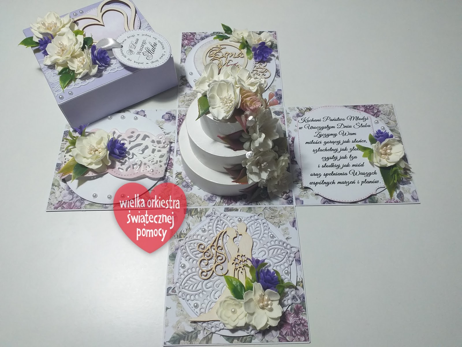 Exploading box w pastelowych, fioletowych kolorach na okazję Ślubu oraz pudełeczko na Chrzest Święty wymiary 10x10x10cm