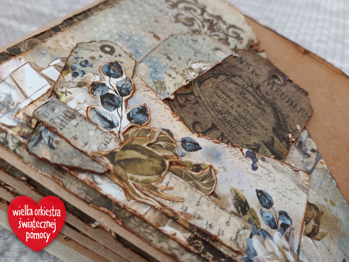 Mam na imię Agnieszka. Dziś przedstawiam Wam album wykonany z beżowo-niebieskiej kolekcji papierów. Album został wykonany w stylu vintage, każda kartka została postarzona, pochlapana i potraktowana złoto-brązową pastą. Album ma wymiar 16x16 cm, pomieści wiele zdjęć. Jeśli podoba Wam się taki efekt, a album zapadł Wam w serce, to zapraszam do licytacji.